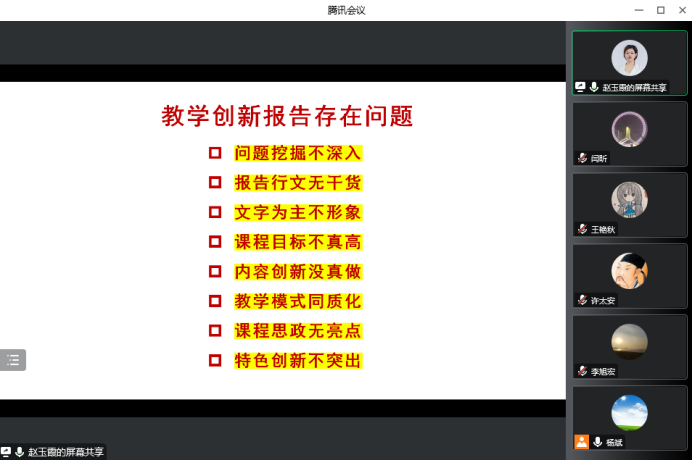 会后,赵玉霞从问题挖掘、报告行文、课程目标等8个方面对学院准备参赛教师的创新报告进行了点评,并一一给出具体的意见和建议。