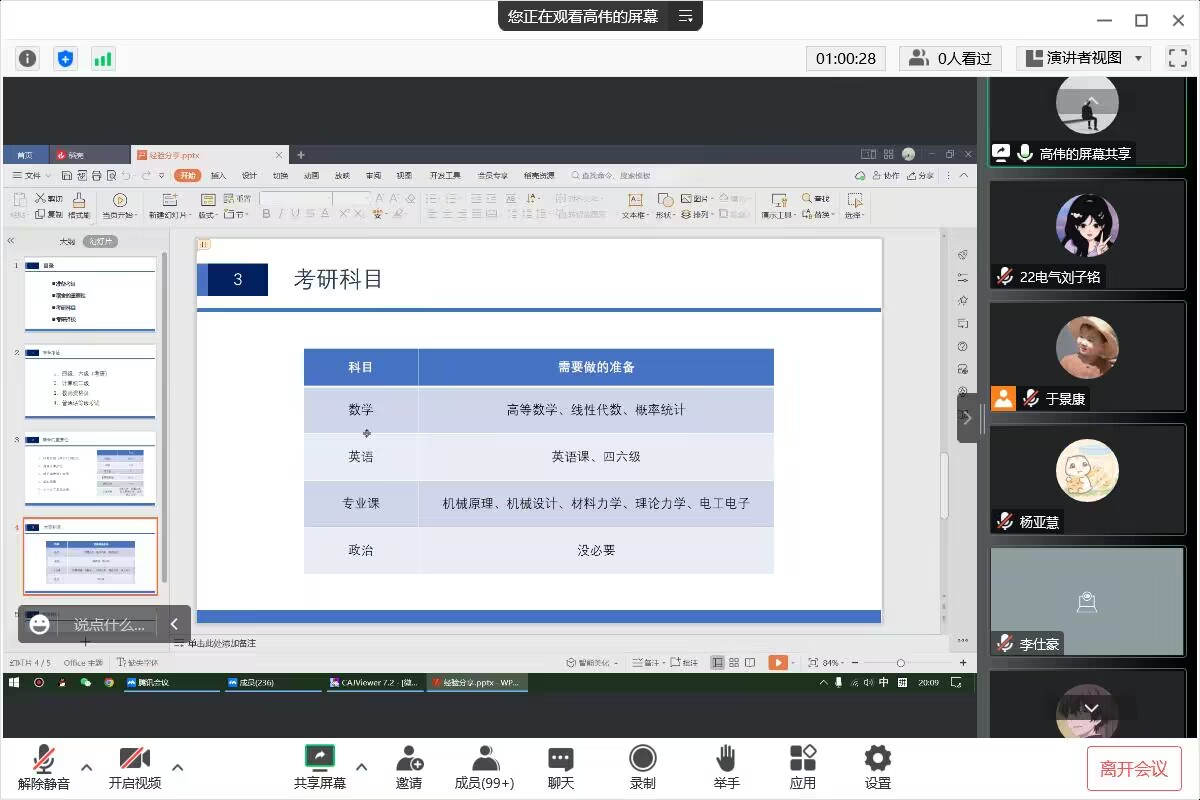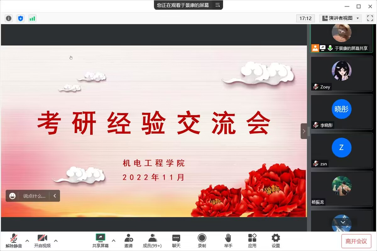 11月18日晚,机电工程学院召开考研经验交流会,进一步加强同学们对研究生考试的认识,了解最新就业形势,做好大学期间的生涯规划。本次交流会邀请4位考研成功的毕业生现场连线,面向大一、大二本科生展开专题分享。