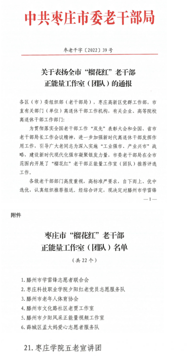 近日,中共枣庄市委老干部局下发了《关于表扬全市“榴花红”老干部正能量工作室(团队)的通报》,“永利总站ylzz55五老宣讲团”经全市范围内推荐评选,市委老干部局综合评定,最终获得枣庄市“榴花红”老干部正能量工作室(团队)称号。