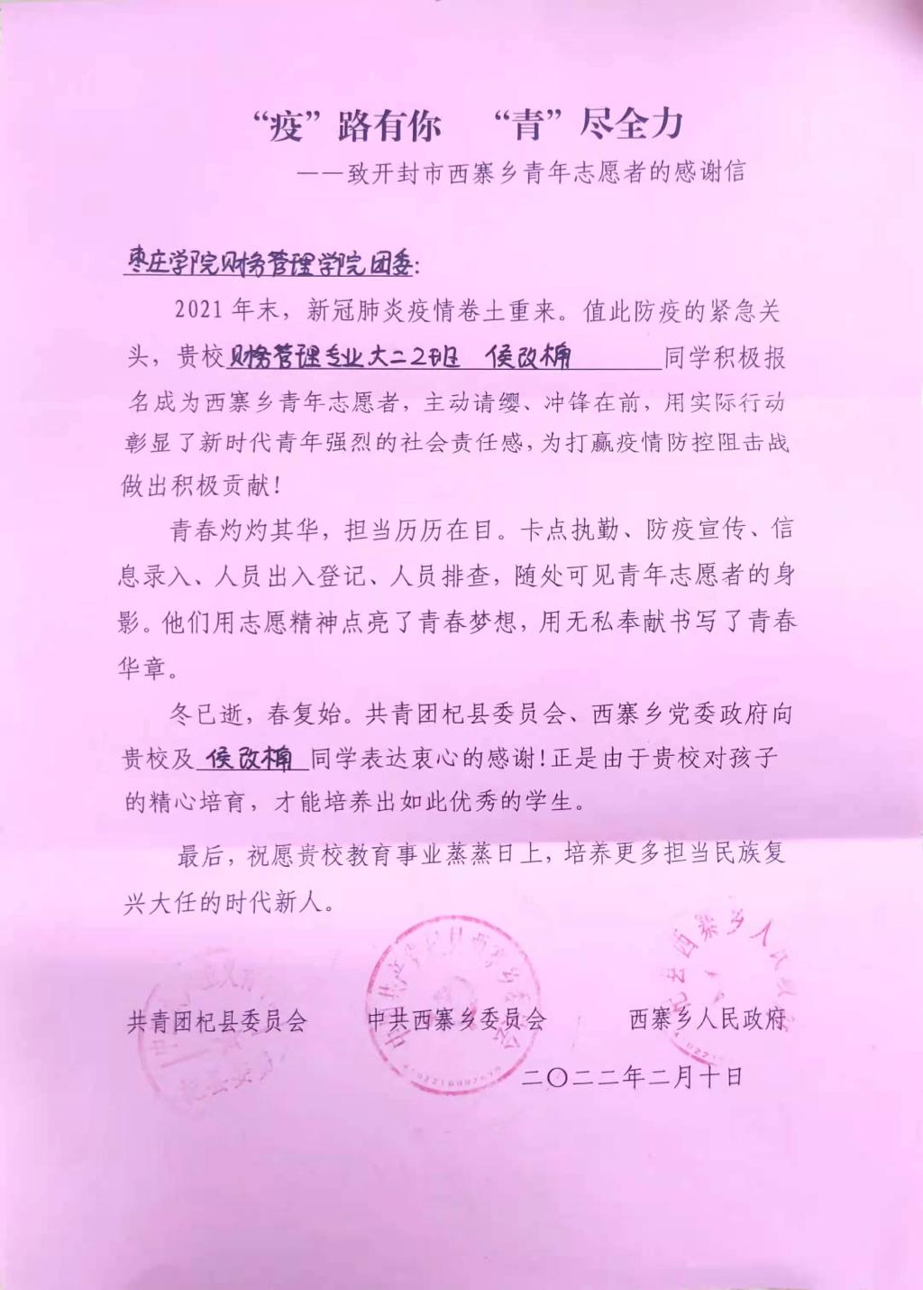 疫情尚未散去,人心不曾远离。近日,经济与管理学院收到来自共青团杞县委员会、中共西寨乡委员会和西寨乡人民政府的感谢信,信中对永利官网经济与管理学院2021级财务管理升本二班学生侯改楠参与疫情防控的事迹予以了表扬,同时对学校教育事业和人才培养工作表达了期望。