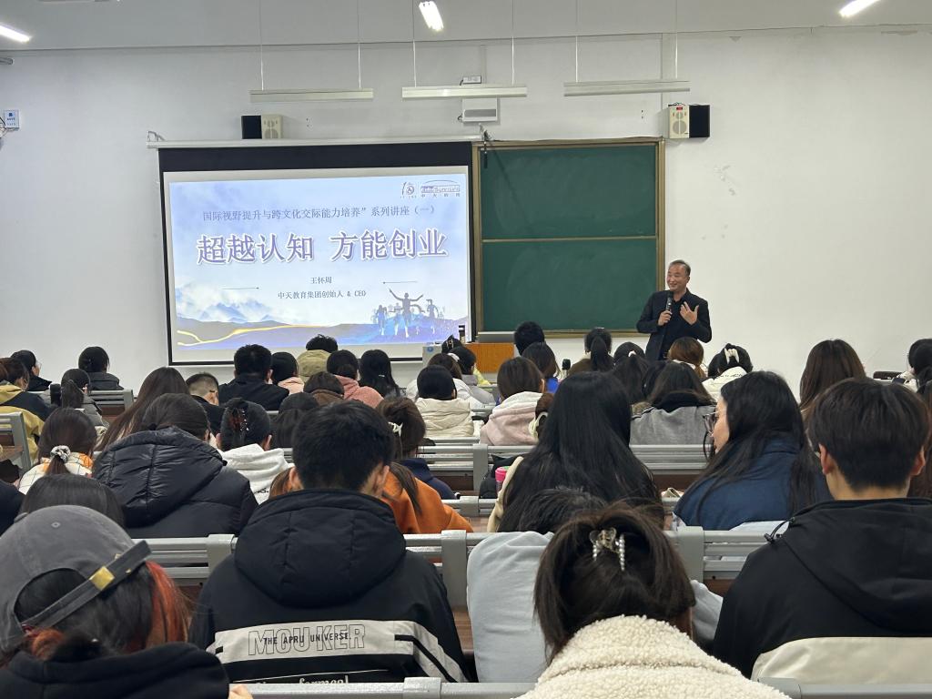 12月4日下午,永利官网“国际视野提升与跨文化交际能力培养”系列讲座第一场在增信楼121举行,活动邀请外国语学院1997级校友,北京中天教育总裁,澳大利亚国际教育文化交流协会执行会长王怀周作报告。讲座由国际交流处处长褚夫敏主持,150余名学生代表聆听了此次讲座。