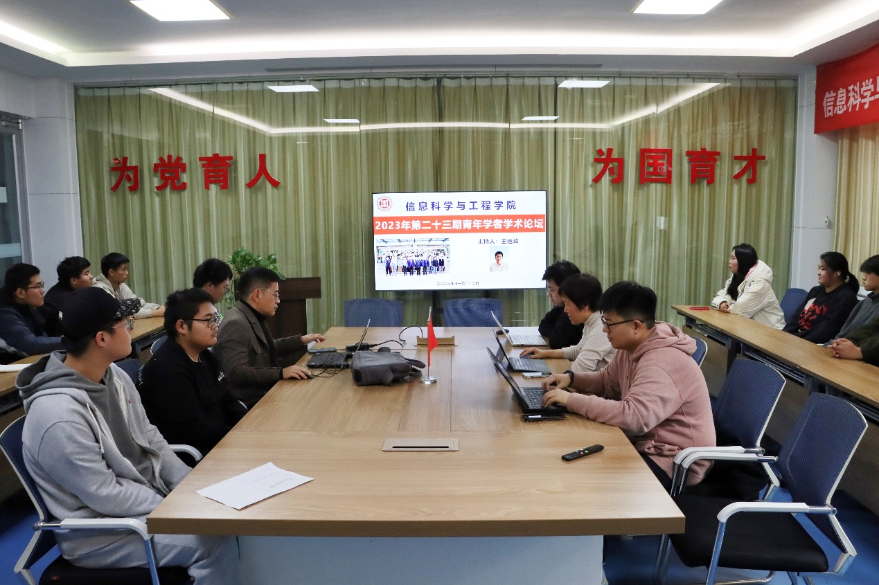 11月22日下午,信息科学与工程学院在墨子楼二楼会议室举办2023年第二十三期青年学者学术论坛,学院科研团队教师和科教融合优秀本科生“三进”提升计划学生代表参加学术论坛,信息网络科研创新团队负责人王运峰博士主持学术论坛。