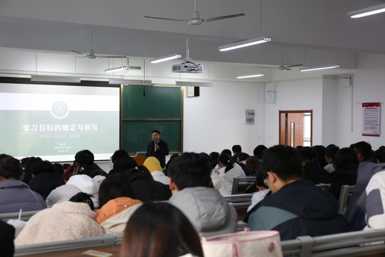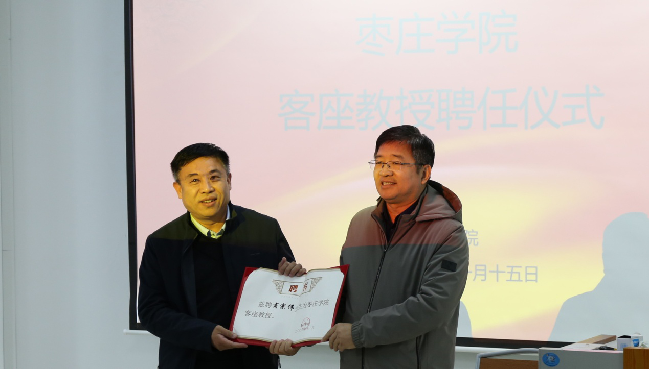 客座教授聘任仪式暨学术报告会由文学院副院长段圣玉主持,他介绍了商宗伟教授及其学术成就,商宗伟教授是枣庄市第十五中学正高级教师、副校长,长期从事中学语文教学与研究,社会兼职或荣誉称号有齐鲁名师、山东省教科院优秀访问学者、枣庄市劳动模范、枣庄名师、枣庄市教学能手、山东省远程研修初中语文省级专家、山东省齐鲁名师名校长领航工作室主持人等。文学院院长张爱民教授为商宗伟教授颁发聘书、合影留念。随后,商宗伟教授以《新课标•新课程•新课堂:学习目标的确定与叙写》为题,从结果性、语用性、三维性、层递性、当堂性、生本性、课程性等七个方面,重点介绍了新课标、新课程、新课堂的学习目标的确定与叙写。他的报告既有深厚的理论深度,又有鲜活的实践案例,对提高文学院师范生的语文理论素养、提升语文教学技能,具有重要的指导意义。