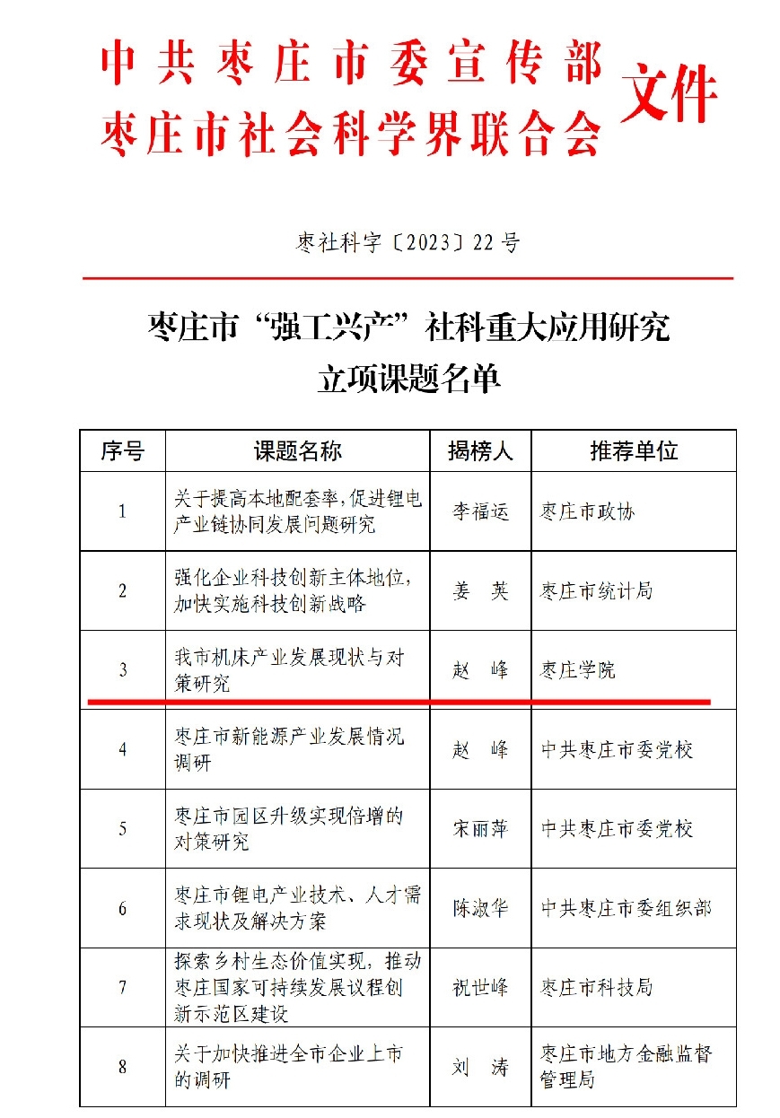 近日,中共枣庄市委宣传部和枣庄市社会科学界联合会公布了枣庄市“强工兴产”社科重大应用研究课题立项名单,永利官网教师赵峰教授揭榜的“我市机床产业发展现状与对策研究”项目成功获批。