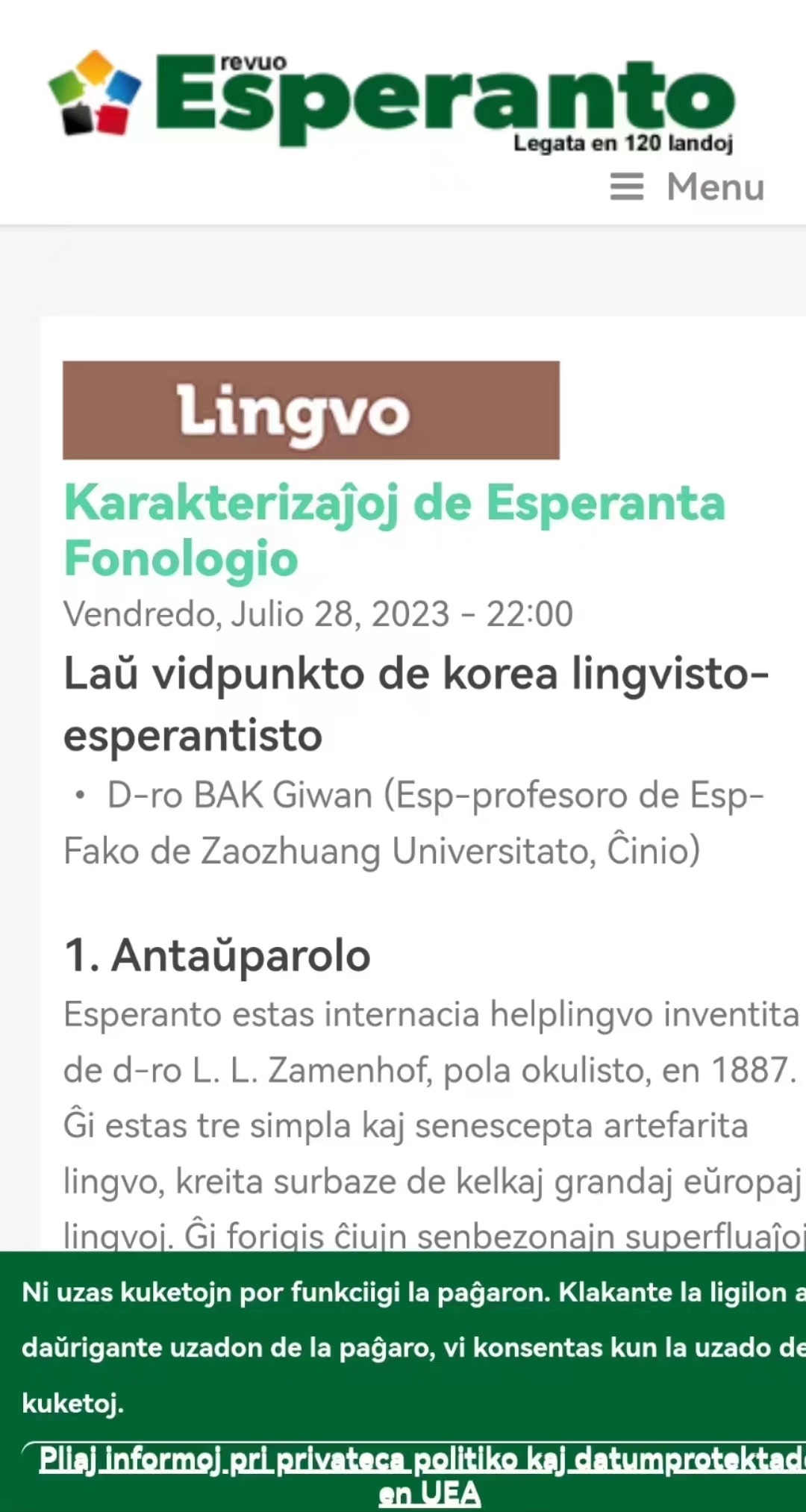 近日,永利官网外籍教师朴基完博士的论文"Karakterizaĵoj de Esperanta Fonologio"(世界语音韵学特征)在国际世界语协会机关刊物《世界语》(Esperanto)2023年第7-8期上发表。论文从音韵学角度分析了世界语的发音、拼读特点,是一篇世界语音韵学高质量论文,引起了国际语言学和世界语学界的关注。