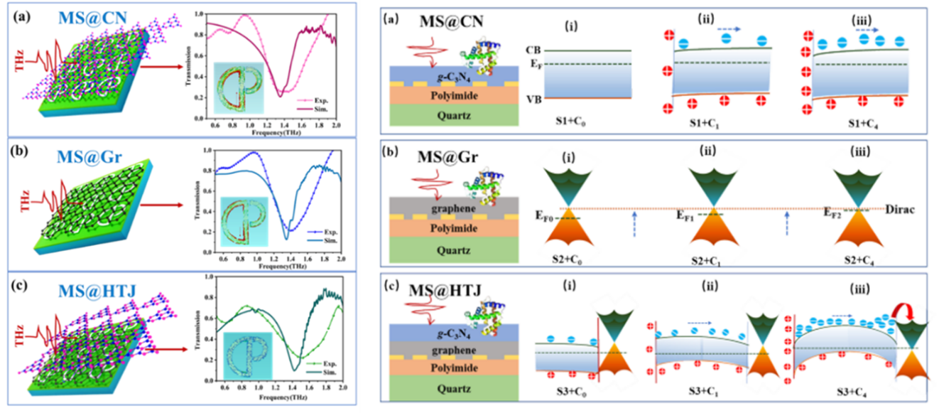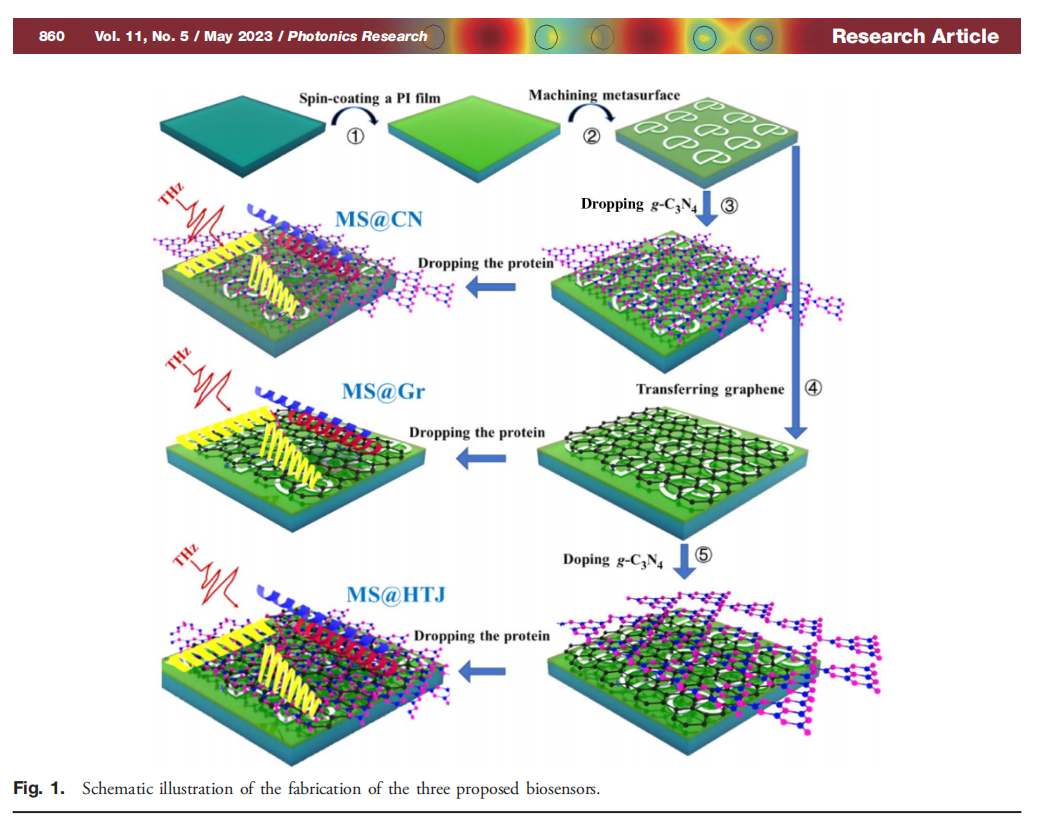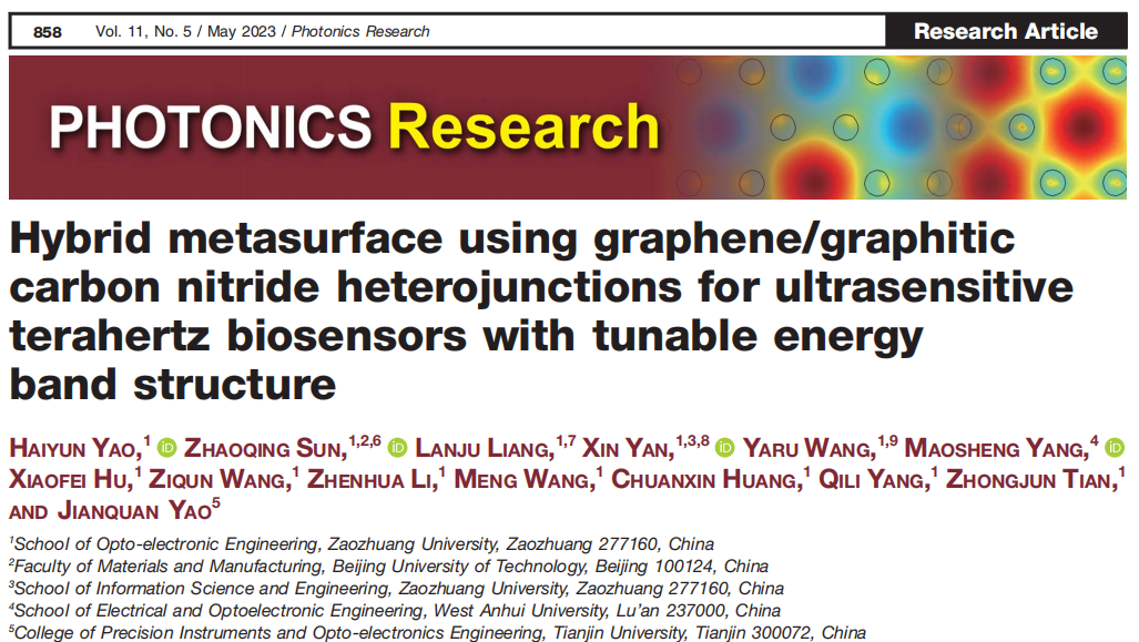 近日,永利官网光电工程学院山东省太赫兹科学技术及应用创新团队梁兰菊教授课题组开发了一种用于检测酪蛋白分子的太赫兹生物传感器,实现了酪蛋白分子的低浓度检测和多维传感。研究成果以“Hybrid metasurface using graphene/graphitic carbon nitride heterojunction for ultrasensitive terahertz biosensor with tunable energy band structure”为题发表在高水平国际期刊Photonics Research。