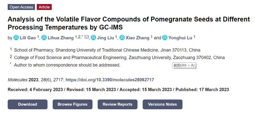 近日,食品科学与制药工程学院联合培养研究生在石榴籽炮制过程风味形成机理研究方面取得最新进展,相关工作发表在生物化学与分子生物学期刊《Molecules》(中科院二区,影响因子4.927)上,论文题目为《Analysis of the Volatile Flavor Compounds of Pomegranate Seeds at Different Processing Temperatures by GC-IMS》,山东中医药大学与永利总站ylzz55为共同完成单位,研究生高丽丽为论文第一作者,导师张立华教授为通讯作者。