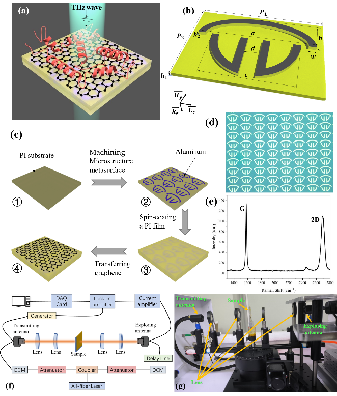 为进一步优化传统超材料在太赫兹波段的传感指标,课题组利用聚酰亚胺材料作为柔性基底,结合电磁诱导透明超材料和石墨烯的独特特性,基于蛋白质分析物对于石墨烯的掺杂影响其费米能级在狄拉克点附近的变化原理,设计了一款探测性能较好的生物传感器。实验结果显示,在以卵清蛋白为分析物的实验中,传感器实现了8.63pg/mL极限。并实现了在幅值、频率、相位三个维度的有效传感。该研究工作为进一步提高目前超材料传感器探测性能提供了新的实验手段,有助于传感器对探测痕量物质的有效检测工作。