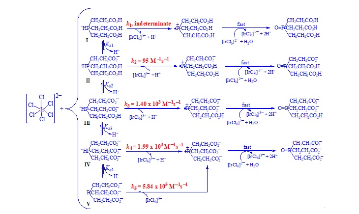 三(2-羧乙基)膦(TCEP)是一著名的强还原剂,广泛应用于化学,生物学和医学的重要反应中。但其在还原单电子氧化剂的反应机理尚不清楚。在本项研究中,使用四价铱配合物作为单电子氧化剂的代表进行详尽研究,提出了令人信服的反应机理,并首次阐明了TCEP不同质子化形态的反应活性,这在化学生物学方向上具有重要的学术及应用价值。