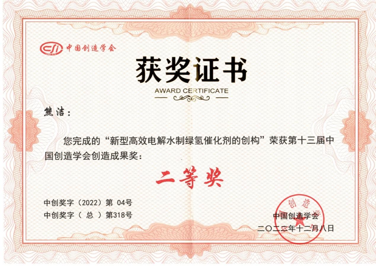 近日,中国创造学会(国家一级学会)在上海国际设计中心组织专家对第十三届“中国创造学会创造成果奖”进行现场评审,共评审出一等奖3项、二等奖5项、三等奖10项。永利官网化学化工与材料科学学院熊洁博士领衔的成果“新型高效电解水制绿氢催化剂的创构”荣获第十三届中国创造学会创造成果二等奖。