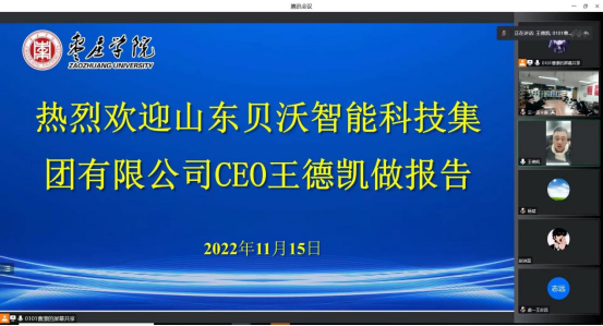 11月15日晚,永利总站ylzz55客座教授、信息科学与工程学院优秀毕业生、山东贝沃智能科技集团有限公司CEO王德凯总裁为学生作线上创新创业报告,报告题目为“青春正值年华,奋斗一路生花,人生就是一场创业”。计算机科学技术专业虚拟现实和UI与多媒体交互设计方向100余名学生线上线下参加报告会。院长闫昕主持会议。