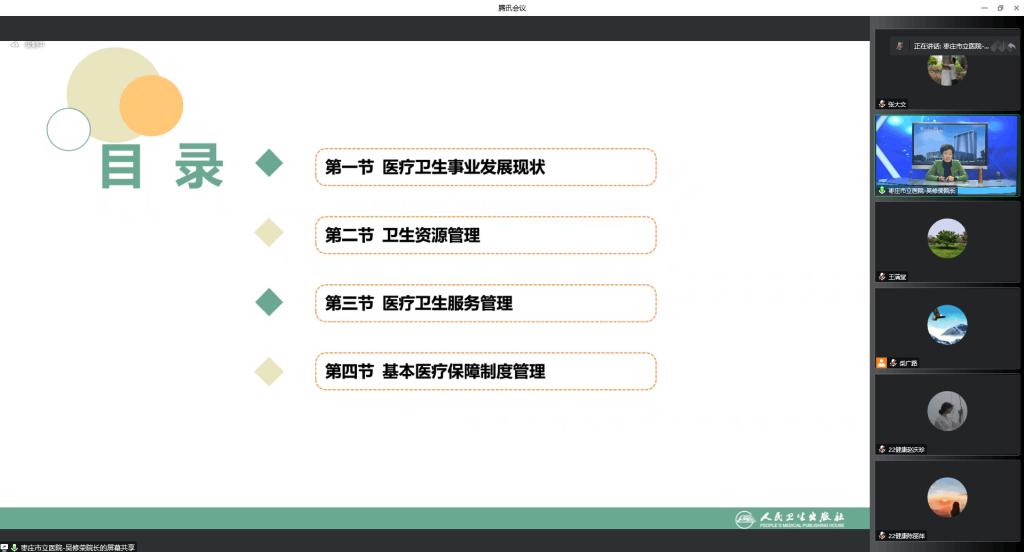 11月11日上午,旅游与资源环境学院邀请枣庄市市立医院院长吴修荣教授通过腾讯会议为2022级健康服务与管理专业学生做专业导读第三讲,报告题目为“医疗卫生事业管理和医院管理”。报告由旅游与资源环境学院院长王满堂主持,健康服务与管理教研室教师及健康服务与管理专业的大一新生参加报告会。