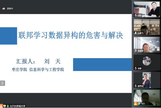 机器学习科研创新团队刘天博士作了题为《联邦学习数据异构的危害与解决》的学术报告。报告介绍了借助联邦学习打破单机机器学习的数据壁障的分布式机器学习范式。针对真实物联网环境中各设备所采集数据的异构性会导致联邦学习模型训练过程中“权重发散”的严重隐患,提出在不引入大量的通信开销且保证数据隐私安全的前提下,提升面向数据异构的联邦学习性能的方法。