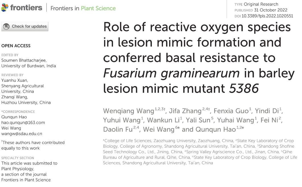 该成果以“Role of reactive oxygen species in lesion mimic formation and conferred basal resistance toFusarium graminearumin barley lesion mimic mutant 5386”为题发表,永利总站ylzz55为第一单位,王文强博士为论文第一作者,郝群群博士和山东农业大学王玮教授为论文共同通讯作者。本研究得到了王玉海教授和山东农业大学付道林教授的大力支持和国家重点研发计划、国家自然科学基金、山东省自然科学基金等资助。