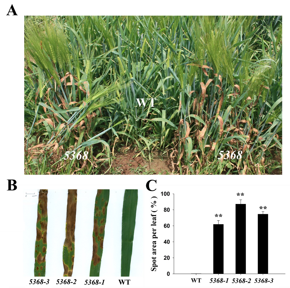 本项目以大麦类病斑突变体5386为研究材料,遗传学分析表明类病斑表型由一个隐性单基因控制,通过BSR-Seq将类病斑基因定位在3H染色体。RNA-seq数据表明大量氧化还原基因参与类病斑的形成过程,进一步研究发现类病斑突变体5386中活性氧含量显著升高,表明活性氧含量的迸发是类病斑形成的重要因素,进一步发现类病斑突变体5386能够显著提高对赤霉病的抗性。本研究具有重要的理论和应用价值,可为麦类作物抗病育种提供新资源。