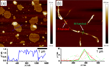 通过对于温度的调控,可以制备出动力学控制的蒽醌类2D-单分子膜,研究表明该聚集体属于一类亚稳态聚集体;该类2D-单分子膜超分子聚集体,可以继续转化为外消旋的手性超分子螺旋聚集体。本工作成功地探究出了该类有机小分子单体转变为2D-单分子膜聚集体,再转化为更为稳定热力学控制的手性超分子螺旋聚集体的机理,并利用原子力显微镜(AFM)和XRD等方法分别对两种聚集体进行了表征(Fig. 2)。该团队关于该蒽醌体系超分子组装的更进一步研究仍在持续进行。
