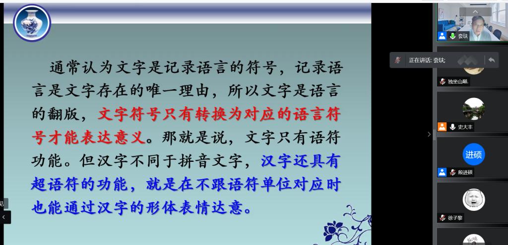 李运富教授强调,汉字的超语符功能是由它的来源和结构特点决定的。起源阶段字符跟语符的不对应性以及字形表达事物的相似原则,影响人们理解和使用汉字。同时,汉字的平面组合性结构特点为发挥汉字的超语符功能提供可能性。最后,李运富教授与在线师生就本次课题的相关问题进行了互动交流。