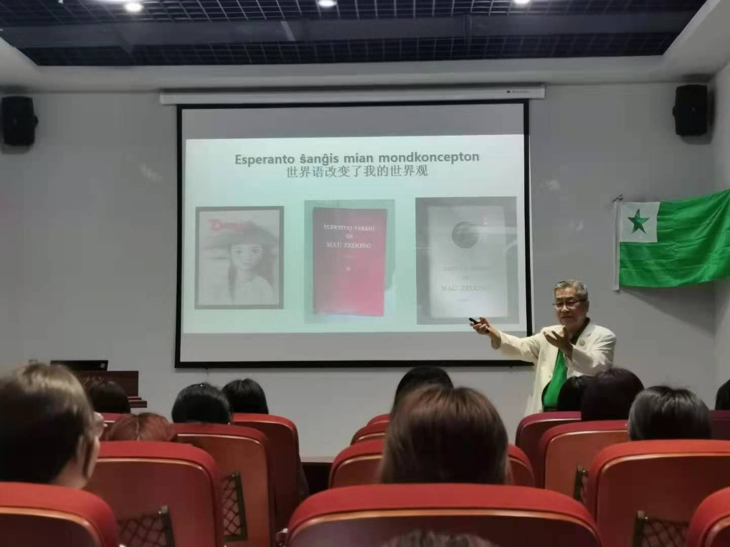 朴基完向同学们讲述了他从学习世界语、参加世界语活动到研究世界语的人生历程。朴基完于1956年出生于韩国浦项市,1973年开始学习世界语,1975-1980年在韩国釜山、首尔等地的大学宣传、教授世界语,其中包括檀国大学。1992年获得了比较语言学博士学位,博士论文为《韩语与世界语的比较》。他多次参加国际世界语大会,并且在会上做学术报告。他通过阅读世界语版《毛泽东选集》,了解了毛泽东思想和社会主义制度的优越性,并改变了自己的世界观。2002年,朴基完毅然来到中国,先后在延边大学、吉林大学从事教学工作。2016年应聘到永利官网教授世界语和韩语。朴基完认为世界语改变了他的一生,使他生活更加幸福、内心更加丰富、视野更加宽广。