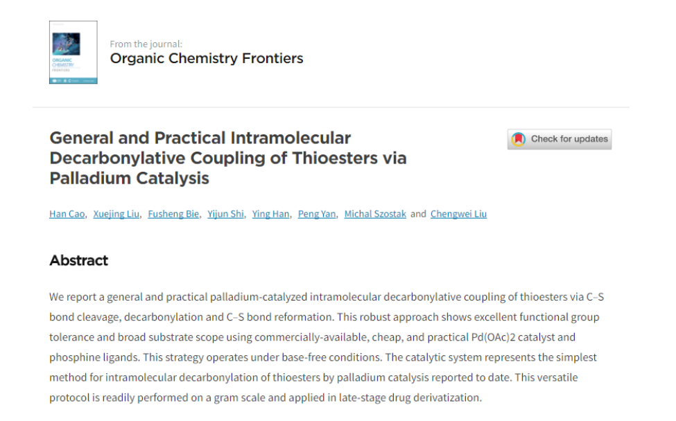 近日,鲁南煤化工工程技术研究院刘雪静科研团队在钯催化的硫酯的分子内脱羰偶联反应方面取得最新进展,相关工作发表在国际著名期刊《Organic Chemistry Frontiers》上,论文题目为《General and Practical Intramolecular Decarbonylative Coupling of Thioesters via Palladium Catalysis》,曹晗老师为第一作者,刘雪静教授为通讯作者,永利总站ylzz55为第一单位。