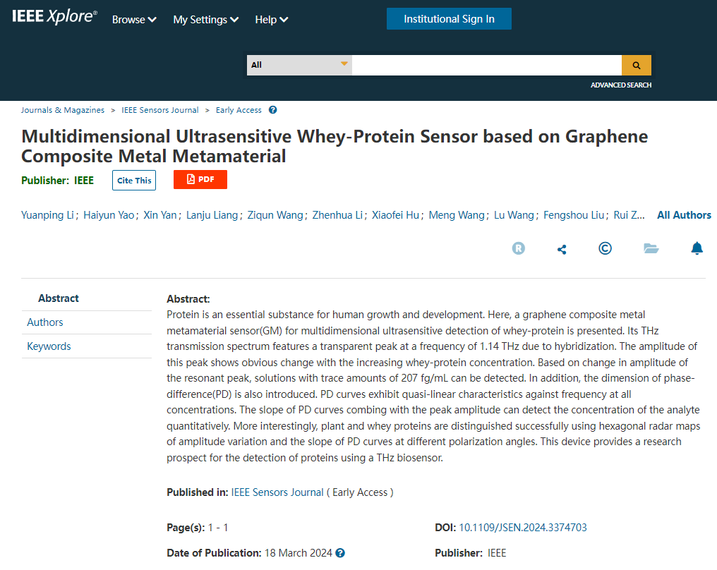 精准检测机体中各种蛋白质含量具有重要意义,然而在复杂样本中实现对蛋白质超灵敏检测依然存在灵敏度低、物理机制不明确等问题。课题组基于石墨烯狄拉克点对外界微环境超灵敏响应特性的物理机制,制备了一种用于乳清蛋白多维超灵敏检测的石墨烯复合金属太赫兹超材料传感器,其太赫兹传输光谱在 1.14THz 频率处具有透明窗口。随着乳清蛋白浓度的增加,透明窗口的幅度显示出明显的变化。根据透明窗口振幅的变化,检测极限为 207 fg/mL 。研究成果为太赫兹传感器检测蛋白提供应用前景。