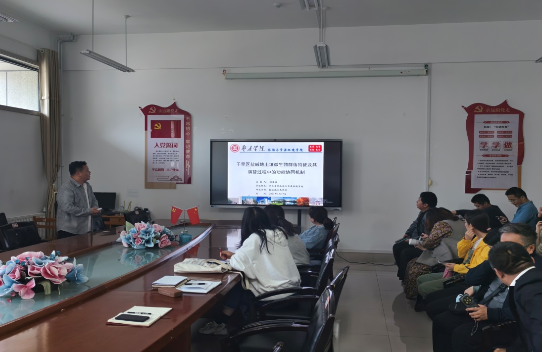 在报告会上,阴法庭博士就“干旱区盐碱地土壤微生物群落特征及其演替过程中的功能协同机制”展开学术报告。阴法庭博士研究表明我国不同生态区盐碱地土壤细菌群落的优势物种具有跨区域的相似性,群落差异主要集中在非优势类群。盐碱弃耕地复垦为农田后的时间序列过程中,细菌群落主导了土壤微生物群落的演替,确定性过程和随机性过程共同影响了盐碱弃耕地复垦后土壤微生物群落的构建,土壤微生物群落网络中物种间的协作能力更强,网络结构趋于简单的同时更加稳定。在土壤微生物群落演替过程中,优势物种主导了功能基因的组成,功能基因的协同效应维持了优势物种的生态位优势。阴法庭博士与相关教师就盐碱地土壤微生物群落的时空演替规律、组装策略和生态功能进行了深入交流与讨论。