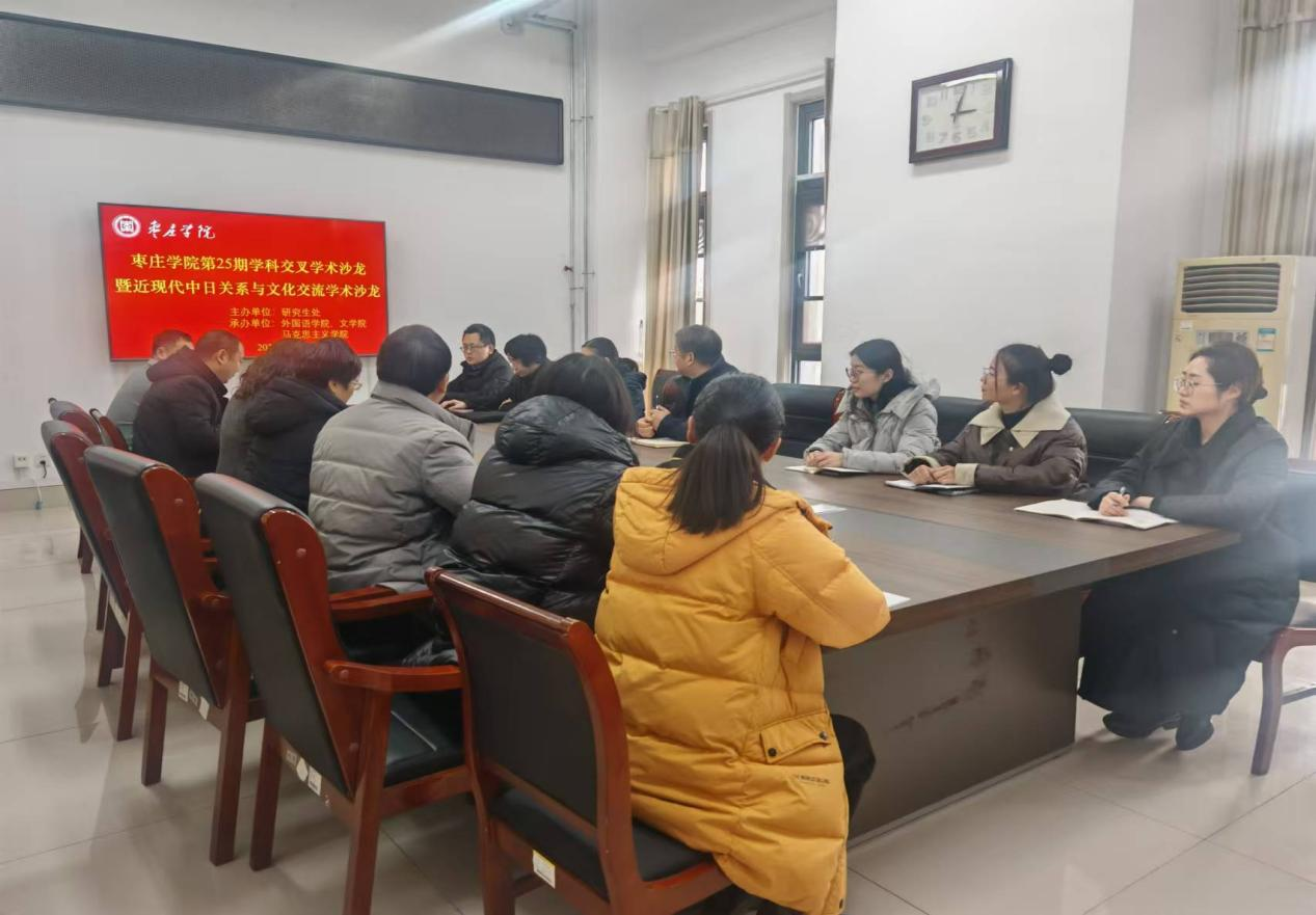 12月27日下午,由校研究生处主办,外国语学院、文学院和马克思主义学院共同承办的第25期学科交叉学术沙龙暨近现代中日关系与文化交流学术沙龙在薛城校区豁然楼A102会议室举行。外国语学院、马克思主义学院和文学院40余人参加了本次学术沙龙。