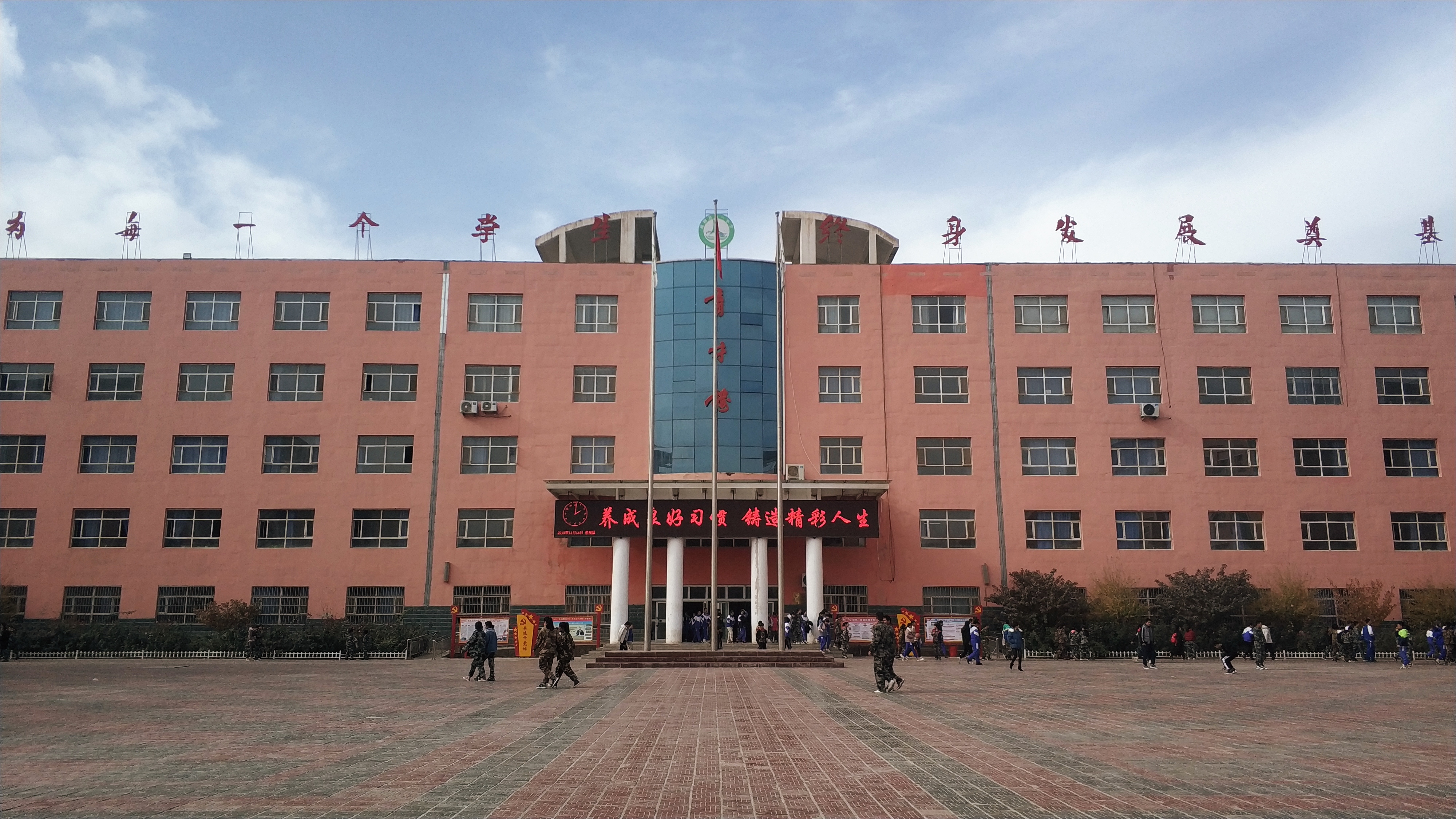 内地天色早已向晚,而这里太阳却依然灿烂。校园寂静,正是上课的时候,八一中学的课堂上孩子们学得正酣,我站在空旷的升旗场上,育德楼,育才楼,育智楼将其环绕。抬头仰望之际,国旗在微风下徐徐飘荡,后面教学楼上“为每一个学生终身发展奠基”的十二个大字十分醒目,真心希望孩子们都能像教学楼的名字一样,成长为一个德才兼备的栋梁之才。
