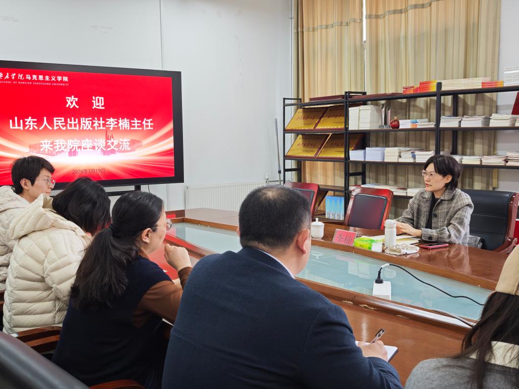 2026-04-17为深入贯彻落实树立和践行正确政绩观学习教育要求,切实把学习成果转化为服务师生、推动发展的具体行动和实际成效,3月19日,马克思主义学院特邀山东人民出版社第四编辑部主任李楠一行来院座谈交流。教研室主任、学院教师代表参加座谈会,党委书记仝锡文主持会议。座谈会上,仝锡文指出,树立和践行正确政绩观核心在于坚持以师生为中心的发展思想,把为教师办实事、解难题作为检验工作成效的重要标准。此次邀请出版社专家进院交...